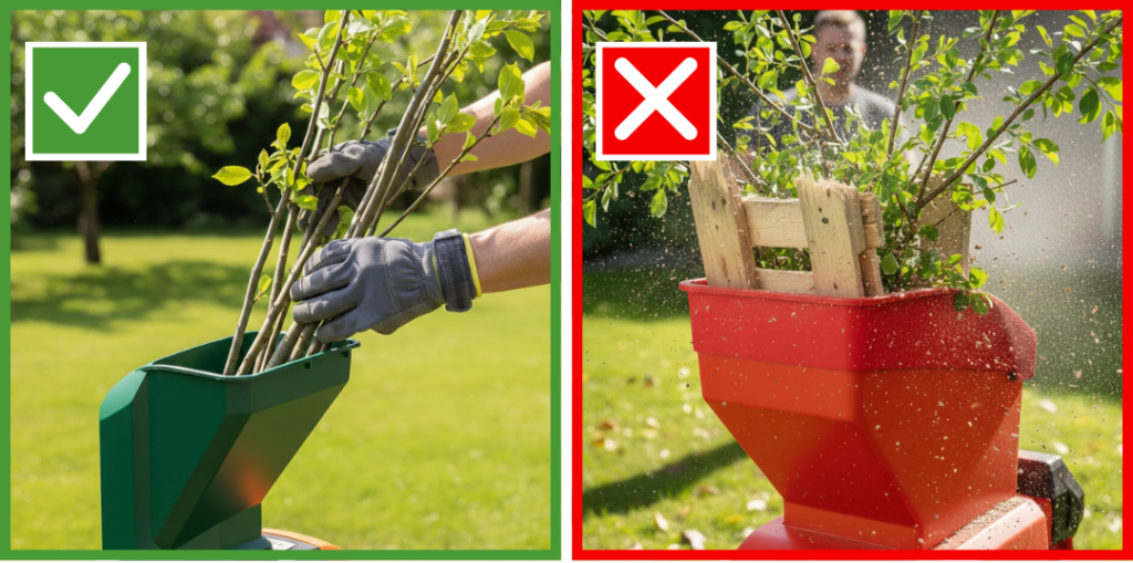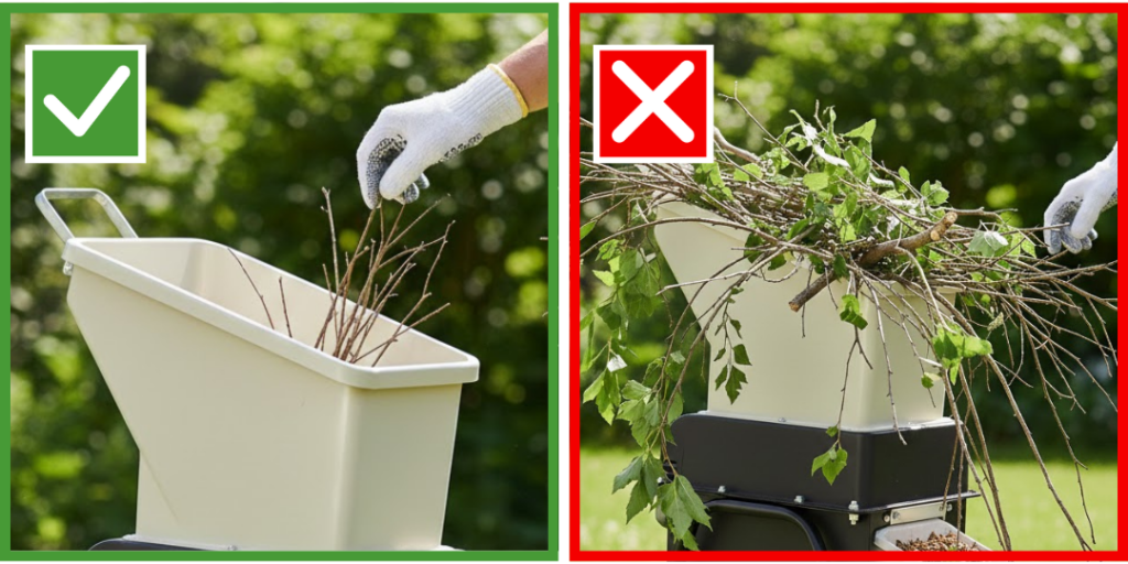 - Cosa evitare: inserire ramaglie sporche di terra o miste a corpi estranei. Anche piccoli oggetti possono scheggiare lame o rovinare rulli e controcoltelli, causando vibrazioni, rumori anomali e un taglio sempre meno efficace.