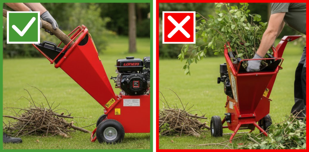 - Cosa fare: mantenere una postura stabile e laterale rispetto all’imbocco, con mani lontane dalla tramoggia e alimentazione effettuata usando l’estremità del ramo come “maniglia”.