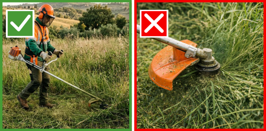 - Cosa evitare: spingere la testina contro la vegetazione o utilizzare il decespugliatore come se fosse una lama frontale. Forzare l’avanzamento provoca sovraccarico, aumento dei consumi e surriscaldamento di frizione e organi interni, riducendo la vita utile della macchina.