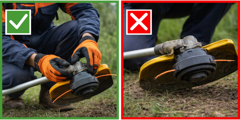 - Cosa fare: controllare che la testina filo o il disco siano montati correttamente e ben serrati, verificando che il filo abbia lunghezza e diametro adeguati al modello. Prestare attenzione anche all’integrità del carter di protezione e della lama taglia filo, che serve a mantenere automaticamente la lunghezza corretta del filo durante il lavoro.