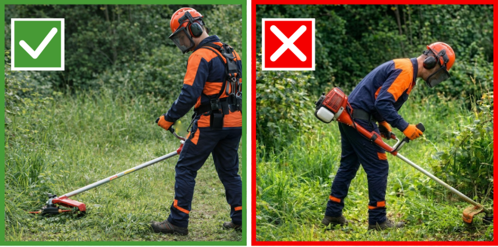 - Cosa evitare: lavorare senza imbragatura o con cinghie regolate male. In queste condizioni si tende a compensare con posture scorrette e movimenti poco controllati, aumentando affaticamento e vibrazioni. Nel tempo questo porta a un uso meno preciso della macchina e a maggiori sollecitazioni su albero e trasmissione, con possibile usura anticipata.